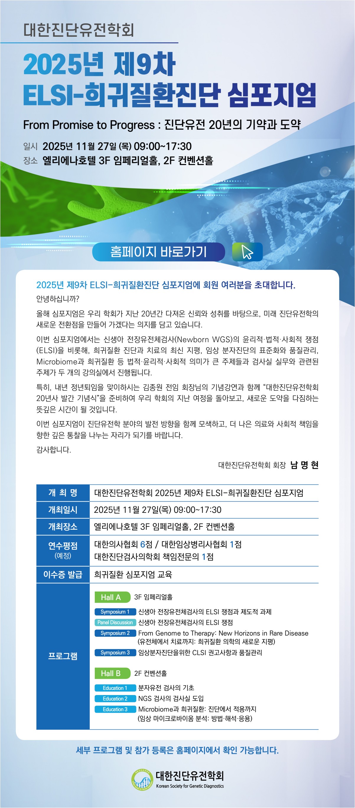 [대한진단유전학회] 2025년 제9차 ELSI-희귀질환진단 심포지엄 개최 안내