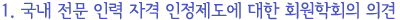 ÀÇÇÐȸ´Â ¼¼ºÎÀü¹®ÀÇ Á¦µµÀÎÁõü°è ¿î¿µÀÇ °³¼±¹æ¾ÈÀ¸·Î ¨çÀÎÁõ ÁÖüÀÇ °ø½Å·ÂÀ» È®º¸Çϱâ À§ÇÑ ¹ýÀû, Á¦µµÀû ÀåÄ¡¸¦ ¸¶·ÃÇϰí, ¨è¼¼ºÎÀü¹®ÀÇ ÀÚ°ÝÀÇ È°¿ë ¹æ¾È¿¡ ´ëÇÑ °¢°èÀÇ ÀǰßÀ» ¼ö·ÅÇÑ ÈÄ ¨éÀÚ°ÝÀ» Ȱ¿ëÇÒ ¼ö ÀÖ´Â ¿©°ÇÀ» Á¶¼ºÇÏ¿© ¸ð ÇÐȸ ¹× °ü·Ã ÇÐȸ °£, ÀÎÁõÇÐȸ ¹× ºñÀÎÁõÇÐȸ °£ÀÇ °³¹æµÈ ³íÀÇÀÇ ÀåÀ» ¸¶·ÃÇϰí, ¨êÀÎÁõÁ¦µµ ¹× ÀýÂ÷¿¡ ´ëÇÑ Áö¼ÓÀûÀ̰í È¿À²ÀûÀÎ À塤´Ü±â È«º¸ Àü·«À» ¼ö¸³Çϸç, ¨ë´Ü°èÀûÀ¸·Î È«º¸ Ȱµ¿À» °ÈÇØ ³ª°¥ °ÍÀÌ´Ù. À̸¦ À§Çؼ´Â Á¦µµÀÎÁõ ÇÐȸ¿¡ ´ëÇÑ Ã¼°èÀûÀÎ »çÈİü¸® ¹× Áö¿øÃ¼°è¸¦ ¼ö¸³Çϰí, Á¦µµ ºñÀÎÁõ ÇÐȸ¿¡ ´ëÇÑ Áö¼ÓÀûÀÎ °ü¸® ¹× Á¦µµÀÎÁõÀ» À§ÇÑ µµ¿ì¹Ì ±â´ÉÀ» °¡µ¿ÇÏ¿©¾ß ÇÑ´Ù. ¶ÇÇÑ, ÀÎÁõÁ¦µµÀÇ °ü¸® ¹× ¿î¿µ»óÀÇ ¹®Á¦Á¡À» ÆÄ¾ÇÇÏ¿© Áö¼ÓÀûÀ¸·Î Á¦µµ¸¦ °³¼±ÇØ ³ª°¥ ¼ö ÀÖµµ·Ï ȯ·ù ü°è(feedback system) ±â´É Á¤¸³À» À§ÇÑ ¼¼ºÎ ÀýÂ÷¸¦ ¼³°èÇØ¾ß ÇÑ´Ù. ƯÈ÷ ¼¼ºÎÀü¹®ÀÇ Á¦µµÀÇ º»¿øÀû ÀåÁ¡À» »ì¸®±â À§Çؼ´Â ÀÇÇÐȸ »êÇÏ ÇÐȸµéÀÇ Àǰ߼ö·ÅÀ» ÅëÇØ Á¤Ã¥ °ø°¨´ë¸¦ È®°íÈ÷ ÇÏ°í °øÀ¯ÇØ¾ß ÇÑ´Ù.