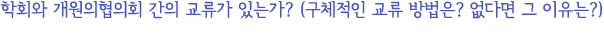 | 1°³¸¦ Á¦¿ÜÇÑ ¸ðµç ´Üü°¡ ÀÖ´Ù°í ÇÏ¿´´Ù. ±³·ù ¹æ¹ýÀº Çмú´ëȸ(64%, 77%)³ª Á¤±âÀû ¶Ç´Â ºÎÁ¤±âÀû ȸÀÇ(86%, 85%)¸¦ ÅëÇØ¼ ÇÏ¿´°í Ä£¸ñȰµ¿(29%, 46%)À» ÅëÇØ¼µµ ÀϺΠ±³·ù°¡ ÀÖ¾ú´Ù. 1°³ÀÇ Àü¹®°ú¸ñ¿¡¼ »óÈ£°£ ±³·ù°¡ ¾ø´Ù°í ÇÏ¿´°í ±× ÀÌÀ¯´Â °³¿øÀÇ ´ÜüÀÇ ¸íĪ¿¡ ´ëÇÑ ÀÌ°ß ¶§¹®À̾ú´Ù. |