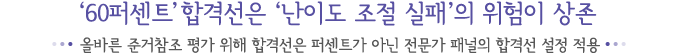 60ÆÛ¼¾Æ®·Î °íÁ¤µÈ Çհݼ±ÀÌ Àü¹®ÀÇ ½ÃÇèÀ» À§ÇÑ ¹®Ç×°³¹ß°ú ¼±Åÿ¡ ¹ÌÄ¡´Â ¿µÇâÀº º¸´Ù ½É°¢ÇÏ´Ù. Àü¹®ÀÇ ½ÃÇèÀÇ ¹®Ç×Àº ÇØ´ç °ú¸ñ Àü¹®ÀǷμÀÇ Á÷¹«¸¦ ¼öÇàÇϴµ¥ ÇÊ¿äÇÑ ÃÖ¼Ò¿ª·®À» °®Ãß¾ú´ÂÁö ¿©ºÎ¸¦ Æò°¡ÇÒ ¼ö ÀÖ¾î¾ß ÇÑ´Ù. ±×·¸Áö¸¸ ½ÇÁ¦¿¡¼ ½ÃÇè¹®Á¦ ¼±ÅÃÀ§¿øµéÀº Çհݼ± ¼öÁØ¿¡ ÀÎÁ¢ÇÑ ³À̵µÀÇ ¹®Ç×À» ¼±ÅÃÇÒ ¶§ ¿¹»óµÇ´Â ´ë·® ³«¹æ¿¡ ´ëÇÑ ¿ì·Á, ÇÑ ¹øÀÇ ½ÃÇèÀ» °¡Áö°í ¼ö·Ã±â°£ µ¿¾ÈÀÇ ¼ºÃ븦 °áÁ¤ÇÏ´Â °Í¿¡ ´ëÇØ ºÎ´ãÀ» °®Áö ¾ÊÀ» ¼ö ¾ø´Ù. ±×·¯±â¿¡ Çհݼ±À¸·ÎºÎÅÍ ¾ÈÀü°Å¸®¸¦ À¯ÁöÇÒ ¼ö ÀÖµµ·Ï, ¹®Á¦ÇذáÇü °°Àº ¼öÁØ ³ôÀº ¹®Ç׺¸´Ù ´Ü¼ø ¾Ï±âÇü ¹®Ç×À», ¾î·Á¿î ¹®Ç× º¸´Ù ½¬¿î ¹®Ç×À» ¼±ÅÃÇÒ ¼ö¹Û¿¡ ¾ø°Ô µÇ°í Àü¹®ÀÇ ÀڰݽÃÇèÀÇ Àǹ̴ Åð»öµÇ°í ÀÖ´Ù. ¶Ç Çϳª °£°úÇÏÁö ¸»¾Æ¾ß ÇÒ °ÍÀº ¡®60ÆÛ¼¾Æ®¡¯¶ó´Â Çհݼ±¿¡ ÀÇÇÑ ´ç¶ô°áÁ¤¿¡¼´Â ¿ª·®ÀÌ ÃæºÐÇÏÁö¸¸ ¡®¾ï¿ïÇÑ¡¯ ³«¹æ°ú ¿ª·®ÀÌ ºÎÁ·ÇÏÁö¸¸ ¡®À§ÇèÇÑ¡¯ ÇÕ°ÝÀÌ »ý±æ ¼ö ÀÖ¾î °íºÎ´ã ½ÃÇè¿¡ ¿ä±¸µÇ´Â °øÁ¤¼º, ½Å·Ú¼ºÀÌ ÈѼյǰí Áø·á¿¡¼ ȯÀÚ¾ÈÀü°ú Áú¿¡ ¹®Á¦¸¦ ÃÊ·¡ÇÒ ¼ö ÀÖ´Ù´Â Á¡ÀÌ´Ù.