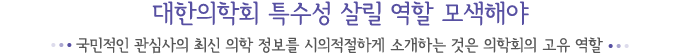 ´õ °´°üÀûÀ¸·Î »ìÆìº¸¸é, ´ëÇÑÀÇÇÐȸ´Â ±× ±Ô¸ð¿Í ¿ª»ç¿¡ ºñÇØ ±¹³» ÀÇ·á°èÀÇ Â÷º°È¶ó´Â Ãø¸é¿¡¼ ºÎÁ·ÇÑ ºÎºÐÀÌ ¸¹´Ù°í »ý°¢ÇÑ´Ù. ½ÇÁúÀûÀ¸·Î ´ëÇÑÀÇÇÐȸ´Â ±¹³» 41°³ Àǰú ´ëÇп¡ ÀûÀ» µÎ°í ÀÖ´Â 9,669¸í(2011)ÀÇ ±³¼ö°¡ ȸ¿øÀ¸·Î ±¸¼ºµÈ ±â°üÀ̶ó°íµµ ÇÒ ¼ö ÀÖ´Ù. ÀÇÇù°ú´Â »óÈ£ º¸¿ÏÀû °ü°è¿¡¼ ºÐ¸í Â÷º°ÈµÈ ¿ªÇÒ°ú ±â´ÉÀ» °¡Áú ¼ö ÀÖ´Ù´Â ¶æÀÌ´Ù. µû¶ó¼ ´ëÇÑÀÇÇÐȸ¸¸ÀÇ ¹ßÀüÀû ±æÀ» ÃæºÐÈ÷ ¸ð»öÇÒ ¼ö ÀÖ¾î¾ß ÇÑ´Ù. ÇÏÁö¸¸ µ¿·á ÀÇ»ç, ƯÈ÷ °³¿ø°¡ ÀÇ»çµé¿¡°Ô ´ëÇÑÀÇÇÐȸ¿¡ ´ëÇÑ ÀνÄÀÌ ±×¸® ³ôÁö ¾Ê´Ù´Â Á¡Àº ¸¹Àº °ÍÀ» ½Ã»çÇÑ´Ù. ´ëÇÑÀÇÇÐȸ°¡ °®°í Àִ Ư¼ö¼ºÀ» ÃæºÐÈ÷ Â÷º°ÈÇÏ°í ºÎ°¢½ÃŰÁö ¸øÇϰí ÀÖ´Ù´Â ¶æÀÌ´Ù. ÇöÀç ´ëÇÑÀÇÇÐȸÀÇ ¸ðüÀÎ ÀÇÇùÀÌ Æ÷°ý¼ö°¡Á¦ µµÀÔ Á¦µµ °°Àº Çö¾È¿¡ ¹ß¸ñÀ» ÀâÇô ÀÇ·á ¼ÒºñÀÚÀÎ ±¹¹Î°úÀÇ ¼ÒÅëÀÌ Á¡Á¡ ¾Çȵǰí ÀÖ´Ù. ±×°£ ¿ì¸® ÀÇ·á°è´Â Áö±Ý±îÁö ³Ê¹« ¿ì¸®³¢¸® ¡®³»±³(Ò®Îß)¡¯¿¡¸¸ ¸¹Àº ½Ã°£À» ¼ÒºñÇÏ¿´´Ù´Â ÀÚ¼ºÀÇ ¸ñ¼Ò¸®°¡ ÀÖ´Ù. ÀÌÁ¦ ´ë±¹¹Î ¡®¿Ü±³(èâÎß)¡¯È°µ¿ÀÌ Àý½ÇÇÏ´Ù´Â ¶æÀÌ´Ù. ÀÌ·± Çö½Ç¿¡¼ ±¹³»ÀÇ·á°è¸¦ ´ëÇ¥ÇÏ´Â ÀÇÇùÀÇ À§»óÀ» ³ôÀ̸鼵µ ´ëÇÑÀÇÇÐȸ°¡ ¹Ýµå½Ã ¼öÇàÇØ¾ß ÇÒ Â÷º°ÈµÈ °úÁ¦ Çϳª¸¦ Â÷ºÐÈ÷ Á¦¾ÈÇØº¸°íÀÚ ÇÑ´Ù.