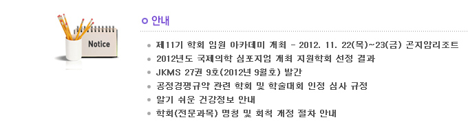 2012³âµµ ±¹Á¦ÀÇÇÐ ½ÉÆ÷Áö¾ö °³ÃÖ Áö¿øÇÐȸ ¼±Á¤ °á°ú JKMS 27±Ç 9È£(2012³â 9¿ùÈ£) ¹ß°£ °øÁ¤°æÀï±Ô¾à °ü·Ã ÇÐȸ ¹× Çмú´ëȸ ÀÎÁ¤ ½É»ç ±ÔÁ¤ ¾Ë±â ½¬¿î °Ç°­Á¤º¸ ¾È³» ÇÐȸ(Àü¹®°ú¸ñ) ¸íĪ ¹× ȸĢ °³Á¤ ÀýÂ÷ ¾È³»