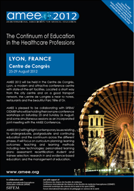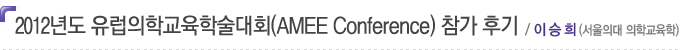 AMEE Çмú´ëȸ´Â ¸Å³â 8¿ù ¸» ~ 9¿ù ÃÊ À¯·´ÀÇ °¢±¹À» ¼øÈ¸ÇÏ¸é¼ °³Ãֵǰí ÀÖÀ¸¸ç À¯·´»Ó ¾Æ´Ï¶ó Àü ¼¼°èÀÇ ÀÇÇб³À° °ü°èÀÚµéÀÌ Âü°¡ÇÏ´Â ±¹Á¦ÀûÀÎ Çмú´ëȸÀÌ´Ù. 2012³âµµ AMEE Çмú´ëȸ´Â 8¿ù 27ÀϺÎÅÍ 29ÀϱîÁö 3Àϰ£ ÇÁ¶û½º ¸®¿Ë¿¡¼ °³ÃֵǾúÀ¸¸ç ¡®The continuum of education in medicine and the healthcare professions¡¯¸¦ ÁÖÁ¦·Î ÃÑ 6°³ÀÇ Plenary sessions¿Í 18°³ÀÇ ½ÉÆ÷Áö¾ö, 50°³ÀÇ ÀÚÀ¯¿¬Á¦, 8°³ÀÇ Æ¯º°¿¬±¸³í¹® ¹ßÇ¥, 50¿© °³ÀÇ »çÀü ¿öÅ©¼ó°ú 60¿© °³ÀÇ º» ¿öÅ©¼ó ±×¸®°í ¾à 1,000¿© °³ÀÇ Æ÷½ºÅÍ ¹ßÇ¥·Î ±¸¼ºµÇ¾ú´Ù. Âü°¡ÀοøÀº 106°³±¹¿¡¼ 3,100¿©¸íÀ¸·Î 1973³â AMEE Çмú´ëȸ°¡ ½ÃÀÛµÈ ÀÌ·¡ ÃÖ´ë Âü°¡ÀοøÀ» ±â·ÏÇÏ¿´´Ù.