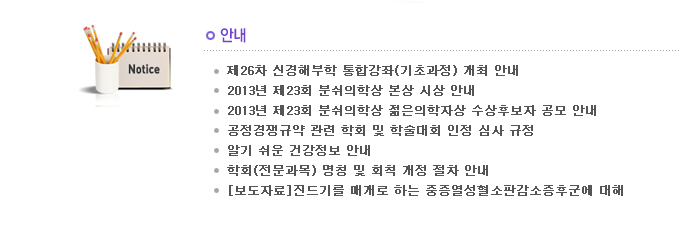 Á¦26Â÷ ½Å°æÇغÎÇÐ ÅëÇÕ°­ÁÂ(±âÃʰúÁ¤) °³ÃÖ ¾È³» 2013³â Á¦23ȸ ºÐ½¬ÀÇÇÐ»ó º»»ó ½Ã»ó ¾È³» 2013³â Á¦23ȸ ºÐ½¬ÀÇÇлó ÀþÀºÀÇÇÐÀÚ»ó ¼ö»óÈĺ¸ÀÚ °ø¸ð ¾È³» °øÁ¤°æÀï±Ô¾à °ü·Ã ÇÐȸ ¹× Çмú´ëȸ ÀÎÁ¤ ½É»ç ±ÔÁ¤ ¾Ë±â ½¬¿î °Ç°­Á¤º¸ ¾È³» ÇÐȸ(Àü¹®°ú¸ñ) ¸íĪ ¹× ȸĢ °³Á¤ ÀýÂ÷ ¾È³» [º¸µµÀÚ·á]Áøµå±â¸¦ ¸Å°³·Î ÇÏ´Â ÁßÁõ¿­¼ºÇ÷¼ÒÆÇ°¨¼ÒÁõÈıº¿¡ ´ëÇØ