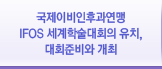 Çмú´ëȸ¸¦ À¯Ä¡ÇÑ ÈÄ °ð IFOS Çмú´ëȸ ÁغñÀ§¿øÈ¸¸¦ ¹ßÁ·½ÃŰ°í °¢Á¾ À§¿øÈ¸ ±¸¼º°ú À§¿øµéÀÇ À§ÃËÀ» Çϴµ¥ °¡±ÞÀûÀ¸·Î Àü±¹¿¡¼ ±¹Á¦ÇÐȸ¿¡ ´ëÇÑ °æÇèÀÌ Ç³ºÎÇÑ È¸¿øÀ¸·Î ±¸¼ºÇϰíÀÚ ÇÏ¿´´Ù. ±¹³»¿¡¼´Â ¾à 200¿©¸íÀÇ È¸¿øµéÀÌ ÇÁ·Î±×·¥ ÀÛ¼º À§¿øÈ¸³ª ÀÚ¹®À§¿ø¿¡ À§Ã˵Ǿú´Ù. ´ëÇÑÀ̺ñÀÎÈİúÇÐȸ¿Í ´ëÇÑÀ̺ñÀÎÈİú °³¿øÀÇ»çȸÀÇ Çмú´ëȸ¿¡¼ IFOS¼¼°èÇмú´ëȸ¿¡ ´ëÇÑ È«º¸¸¦ Áö¼ÓÇÏ¿´´Ù. ±¹Á¦ÀûÀ¸·Î´Â °¡´ÉÇÏ¸é ´õ ¸¹Àº ȸ¿øµéÀÌ °ü½ÉÀ» °¡Áö°Ô ÇÏ°í ¶Ç ±×µéÀÌ Á÷À§¸¦ ÀÌ¿ëÇÏ¿© ¿©±ÇÀ̳ª ºñÀÚ¸¦ ¹ÞÀ» ¶§ µµ¿òÀ» ¹Þµµ·Ï °¢±¹À¸·ÎºÎÅÍÀÇ ¾à 700¸íÀÇ ±¹Á¦ÀÚ¹®À§¿øÀ» À§ÃËÇÏ¿´´Ù.