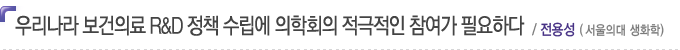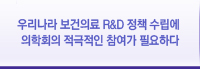 | ±¹°¡ º¸°ÇÀÇ·á R&D »ç¾÷ÀÇ ±âȹ°ú ¿¹»ê È®º¸´Â º¸°Çº¹ÁöºÎ¿Í ¹Ì·¡Ã¢Á¶ºÎ°¡ Çϰí, ¿¬±¸ °ü¸®´Â Çѱ¹¿¬±¸Àç´ÜÀ̳ª º¸°Ç»ê¾÷ÁøÈï¿øÀÌ ÁÖ·Î ¼öÇàÇϰí ÀÖ´Ù. ¶ÇÇÑ ÁÖ¿ä ±¹°¡°úÇÐ Á¤Ã¥°ú ¿¬±¸°³¹ß ¿¹»êÀº ±¹°¡°úÇбâ¼ú½ÉÀÇȸ¿¡¼ ½ÉÀÇÇÑ´Ù. º¸°ÇÀÇ·áÀÇ Àü¹®°¡µéÀº ¿ì¸®³ª¶ó º¸°ÇÀǷḦ ¹ßÀü½Ã۱â À§Çؼ º¸°ÇÀÇ·á R&D Á¤Ã¥ ¼ö¸³¿¡ Àû±ØÀûÀ¸·Î Âü¿©ÇØ¾ß ÇÒ Àǹ«°¡ ÀÖ´Ù. ÀÇÇÐ ¿¬±¸ÀÚµéÀÌ º¸°ÇÀÇ·á ¿¬±¸»ç¾÷À» ±âȹÇϰųª °ü¸®ÇÏ´Â °¢Á¾ À§¿øÈ¸ µî¿¡ Âü¿©Çϰųª ¿¬±¸ºñ°ü¸®±â°ü¿¡ ÆÄ°ßµÇ¾î ±Ù¹«Çϰí ÀÖ´Ù. ±×·¯³ª º¸°ÇÀÇ·á R&D¿¡ ÇÕÀÇµÈ Àå±âÀûÀÎ ¿¬±¸¹æÇâÀÌ ¾ø°í, º¸°ÇÀÇ·á R&D Àü¹Ý¿¡ ´ëÇÏ¿© Ãæ½ÇÇÑ ÀÚ·áµµ È®º¸ÇϱⰡ ¾î·Æ±â ¶§¹®¿¡ º¸°ÇÀÇ·á R&D¿¡ ´ëÇÑ ¹æÇ⼺°ú Àϰü¼ºÀ» À¯ÁöÇÏÁö ¸øÇϰí ÀÖ´Ù. ÀÌ´Â ÀÇÇа谡 ¿ì¸®³ª¶ó º¸°ÇÀǷḦ ´ã´çÇÏ´Â Àü¹®°¡Áý´ÜÀ¸·Î¼ º¸°ÇÀÇ·á R&D Á¤Ã¥¿¡ ÀûÀýÇÑ ¿µÇâ·ÂÀ» Çà»çÇÏÁö ¸øÇϰí ÀÖÀ½À» º¸¿© ÁÖ°í ÀÖ´Ù. µû¶ó¼ ÀÇÇа谡 ¿ì¸®³ª¶ó º¸°ÇÀÇ·á R&D¿¡ ´ëÇÑ Ã¼°èÀû ºÐ¼®°ú ÇÕ¸®ÀûÀÎ ´ë¾ÈÀ» ÁغñÇÏ´Â think-tank ¿ªÇÒÀ» ÇÏ´Â Á¶Á÷À» ±¸¼ºÇÏ¿© Àû±ØÀûÀ¸·Î Ȱµ¿ÇÏ´Â °ÍÀÌ ½Ã±ÞÇÑ »óȲÀÌ´Ù. À̸¦ À§Çؼ´Â °³ÀÎÀÇ ³ë·Âµµ ÇÊ¿äÇÏÁö¸¸ Àü¹®ÇÐȸ¿Í ÇÐȸ¿¬ÇÕüÀÇ ¿ªÇÒÀÌ Áß¿äÇÏ´Ù. ƯÈ÷ ÇØ´ç ºÐ¾ßÀÇ ÀÌÇØ°ü°è¿¡ ¹Î°¨ÇÑ °³º° ÇÐȸº¸´Ù´Â º¸°ÇÀÇ·á Àü¹®ÇÐȸ°¡ ¸ð¿©¼ ±¸¼ºµÈ ÀÇÇÐȸ°¡ ÀÌ·¯ÇÑ ¿ªÇÒÀ» Ȱ¹ßÇÏ°Ô ¼öÇàÇÏ´Â °ÍÀÌ ÇÊ¿äÇϸç, ÀÌ´Â ¿¬±¸°³¹ß Á¤Ã¥¿¡ ´ëÇÑ Á¦¾ÈÀÇ Àü¹®¼º°ú Àϰü¼ºÀ» À¯ÁöÇÒ ¼ö ÀÖµµ·Ï »ó¼³À§¿øÈ¸¸¦ ±¸¼ºÇÏ¿© ¿î¿µÇÏ´Â °ÍÀÌ ¹Ù¶÷Á÷ÇÏ´Ù.