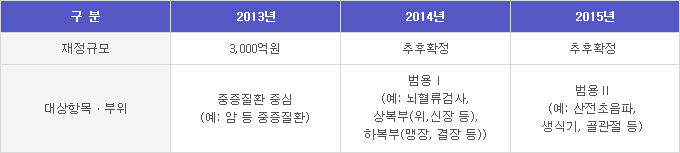 2009³â Á¦11Â÷ °Ç°º¸ÇèÁ¤Ã¥½ÉÀÇÀ§¿øÈ¸(2009.06.16)¿¡¼ °áÁ¤µÈ °Ç°º¸Çè º¸À强 È®´ë°èȹ°ú Á¤ºÎÀÇ 4´ë ÁßÁõÁúȯ º¸À强 °È°èȹ(2013.06.26)¿¡ µû¶ó, 2013³â 10¿ù 1ÀϺÎÅÍ ÃÊÀ½ÆÄ°Ë»ç°¡ ¾ÏȯÀÚ, ³úÇ÷°üÁúȯÀÚ, ½ÉÀåÁúȯÀÚ, Èñ±Í³Ä¡¼ºÁúȯÀÚ¿¡ ´ëÇØ °Ç°º¸Çè ±Þ¿©·Î Àû¿ëµÇ°í ÀÖ´Ù.