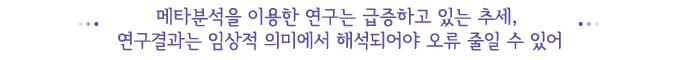 ÇÑÆí Åë°è °á°ú¸¸À» ÀÌ¿ëÇÑ ¸ÞŸºÐ¼®ÀÇ ±â°èÀûÀÎ ÇØ¼®Àº Áø½Ç°ú ´Ù¸¥ ¿¬±¸ °á°ú¸¦ Á¦½ÃÇÒ ¼ö ÀÖ´Ù. ƯÈ÷ Åë°èÀûÀ¸·Î À¯ÀǼºÀ» º¸ÀÌ´Â °á°ú¸¸À» Àú³Î¿¡ ÃâÆÇÇÏ¿© ÃÊ·¡µÇ´Â º¸°í ºñ¶Ô¸²Àº ½ÇÁ¦º¸´Ù ÈξÀ ´õ ³«°üÀûÀ¸·Î ºÎÇ®·ÁÁø °á°ú¸¦ Á¦½ÃÇÒ ¼ö ÀÖ´Â Áß¿äÇÑ ¿À·ù¸¦ ÃÊ·¡ÇÒ ¼ö ÀÖ´Ù. ¸ÞŸºÐ¼®ÀÇ °á°ú´Â ÀÓ»óÀû Àǹ̿¡ ´ëÇÑ ÃæºÐÇÑ °ËÅ並 °ÉÃÄ ÇØ¼®µÇ¾î¾ß ÇÑ´Ù. |