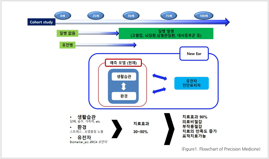 - ÇöÀç±îÁöÀÇ Áúº´¿¹Ãø¸ðµ¨ÀÌ °³°³ÀÎÀ» À§ÇÑ ¸ÂÃãÀÇ·á¿¡´Â ´Ù¼Ò ºÎÁ·ÇÑ Á¡ÀÌ ÀÖ´Ù. ±× ÇÑ ¿¹·Î ¹Ì±¹ÀÇ ÇÁ·¡¹ÖÇÜ ¿¬±¸(Framingham heart study)ÀÇ Áúº´¿¹Ãø ¸ðµ¨¿¡¼´Â °³ÀÎÀÌ ¾Æ´Ñ ÀüüÀûÀÎ Àα¸Áý´ÜÀÇ Áúº´¿¹Ãø ¸ðµ¨À» ÀÌ¿ëÇÑ Áúº´ ¿¹Ãø ¹æ¹ýÀ¸·Î Á¤È®µµ¿¡ À־µ 70~80% ³»¿Ü·Î °³ÀÎ ¸ÂÃãÀÇÇÐÀ» Çϱ⿡´Â ºÎÁ·ÇÑ Á¡ÀÌ ¸¹¾Ò´Ù. ÃÖ±Ù µé¾î, ±Ù°ÅÁß½ÉÀÇÇÐÀÇ ¹ß´Þ·Î ÀÎÇÏ¿© À¯ÀüÀÚ°Ë»ç, À¯ÀüÀÚÀÇ ±â´É ¿¬±¸ ±×¸®°í ¹Ì½ÃÀû ´Ü°èÀÇ Áø´ÜÇ¥ÁöÀÚ(Biomarker)°¡ °³¹ßµÊÀ¸·Î½á °³ÀÎÀÇ ¸ÂÃãÀÇÇп¡ °¡±î¿öÁ³Áö¸¸ ¾ÆÁ÷µµ ¸¹Àº ºÎºÐ¿¡¼ÀÇ ½Éµµ ±íÀº ¿¬±¸°¡ ´õ ÇÊ¿äÇÏ´Ù. ¶ÇÇÑ °³ÀÎ ¸ÂÃãÀÇÇÐÀ» À§ÇÑ Áúº´¿¹Ãø¸ðµ¨ÀÇ »õ·Î¿î ¹æÇâÀ» À§Çؼ ÇöÀç±îÁö ¾Ë·ÁÁø Áúº´°ü·Ã À¯ÀüÀÚ ¶Ç´Â ºÐÀÚ»ý¹°ÇÐÀû BiomarkerÀ» Áúº´¿¹Ãø¸ðµ¨¿¡ Ãß°¡ÇÏ¿© Áúº´ ¿¹Ãøµµ¸¦ ³ôÀÌ´Â °ÍÀÌ ÇÊ¿äÇÏ´Ù. À̸¦ À§Çؼ ´ë±Ô¸ðÀÇ ÀüÇâÀû ¿¬±¸(Cohort study)°¡ ÇÊ¿äÇϰí, À̸¦ ¹ÙÅÁÀ¸·Î Áúº´ÀÇ ¿øÀΰú °á°ú¿¡ µû¸¥ ÀÌÇØµµ¸¦ ³ôÀ̰í, ±× Áß°£¿¡ Biomarker¿Í ºÐÀÚ»ý¹°ÇÐÀûÀÎ ±âÀüÀ» ¼³¸íÇÔÀ¸·Î½á ÇâÈÄ Á»´õ ±Ù°ÅÁß½ÉÀÇ ÀÇÇÐÀ¸·Î °³ÀÎ ¸ÂÃãÀÇÇÐÀ» ´õ¿í ´õ Çâ»ó½Ãų ¼ö ÀÖÀ» °ÍÀÌ´Ù. (Figure 1)