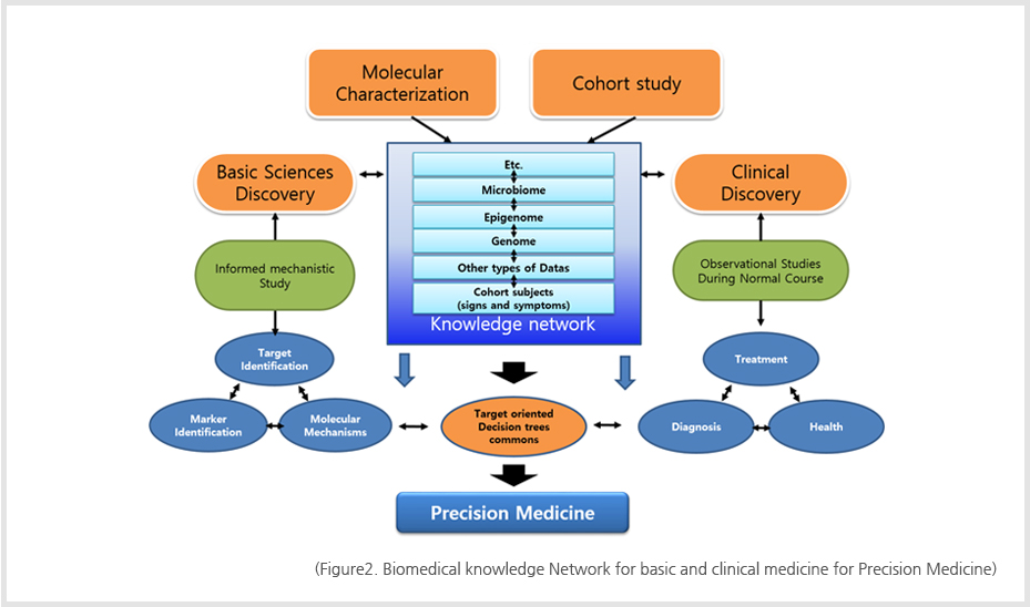 - Á¤¹ÐÀÇÇÐÀ» ½ÇÇàÇϱâ À§Çؼ´Â ¸¸¼ºÁúȯ(³ú Áúȯ, ½ÉÀåÁúȯ, ´ë»çÁõÈıº, ´ç´¢ µî), ¾Ï, Èñ±Í³Ä¡¼ºÁúȯ µîÀÇ ±âÃÊ¿¬±¸ ¿ª·® °È°¡ ÇʼöÀûÀÌ´Ù. À̸¦ À§Çؼ ¿À¹Í½º(Omics (Genomics, Transcriptomics, Proteomics, Metabolomics, Metagenomicsµî)), ºÐÀÚ ¼öÁØÀÇ ¿¬±¸, ȯ°æ°ú »ýȰ½À°üÀ» ÀÌ¿ëÇÑ ´ÙÇÐÁ¦°£ ¿¬±¸°¡ º´ÇàµÇ¾î¾ß¸¸ ÇÑ´Ù. ¶ÇÇÑ ÀÌµé °á°úµéÀ» ÀÌ¿ëÇÑ Áúº´ ³×Æ®¿öÅ© ±Ô¸íÀ» ÅëÇØ¼ Áúº´ÀÇ ¿øÀΰú Áø´Ü Ç¥ÁöÀÚ¸¦ ¹ß±¼ÇÏ´Â °ÍÀº Àα¸Áý´Ü ±â¹ÝÀÇ ÀÇ·áÇàÀ§(population based medical practice)¿¡¼ °³ÀÎ ±â¹ÝÀÇ ÀÇ·áÇàÀ§(sub-population based medical practice)·ÎÀÇ º¯È¸¦ À§ÇÑ ±âÃʰ¡ µÉ °ÍÀÌ´Ù. ÀÌ´Â ÁúȯÀÇ Áø·á¿Í Ä¡·á¸¦ ¼¼ºÐÈÇÏ¿© ¿ÀÁøÀ» ÁÙÀ̰í Á¤È®ÇÑ Áø´ÜÀ» ÇÒ ¼ö ÀÖÀ¸¸ç, Ä¡·á¿¡ À־µ °³Àο¡ ¸Â´Â Ä¡·á¸¦ ÇÔÀ¸·Î½á Ä¡·áÀÇ ¹Î°¨µµ¸¦ ¿Ã¸®°í ±×·Î ÀÎÇØ ¼º°ø·üÀ» ¿Ã¸®°í ºÎÀÛ¿ëÀ» ÁÙÀÏ ¼ö ÀÖ´Ù. °á°úÀûÀ¸·Î ÀÇ·áºñ¿ëÀÇ ºÒÇÊ¿äÇÑ ÁöÃâÀ» ÁÙÀ̰í ȯÀÚ¿¡°Ô ÇÊ¿äÇÑ ¾à¹°ÀÇ ºÎÀÛ¿ëÀ» ÁÙÀÏ ¼ö Àֱ⠶§¹®¿¡ Ä¡·áÀÇ ¼øÀÀµµ¸¦ ȹ±âÀûÀ¸·Î ¿Ã¸± ¼ö ÀÖ´Â ¹Ì·¡ÁöÇâÀûÀÎ º¸°ÇÀÇ·áü°è ¹æÇâÀ¸·Î º¸¿©Áø´Ù(Figure 2). À̸¦ À§Çؼ´Â Àå±âÀû ´ë±Ô¸ðÀÇ ÀüÇâÀû ¿¬±¸¸¦ ÅëÇØ ¿À¹Í½º-ȯ°æ/½À°ü°úÀÇ »óÈ£°ü·Ã¼ºÀÌ ¾î¶² Áúȯ°ú Áúº´À» À¯¹ßÇÏ´ÂÁö, ¶Ç À§Çè¿äÀÎÀÌ ¾ó¸¶³ª ³ëÃâµÇ¸é Áúº´À¸·Î ÁøÇàµÇ´ÂÁö, ¾î¶² Áø´Ü Ç¥ÁöÀÚµéÀÌ ³ªÅ¸³²À¸·Î ÀÎÇØ¼ ÀÌ·± Áúȯ°úÀÇ »ó°ü°ü°è¸¦ ÀÌ·ç°í ÀÖ´ÂÁö¸¦ Àå±âÀûÀÎ ¿ªÇבּ¸¸¦ »ìÆìº½À¸·Î½á Á¤¹ÐÀÇÇÐ ³»Áö´Â °³ÀÎÀÇ ¸ÂÃãÀÇÇп¡ ½±°Ô Á¢±ÙÇÒ °ÍÀ¸·Î ¿¹ÃøµÈ´Ù.