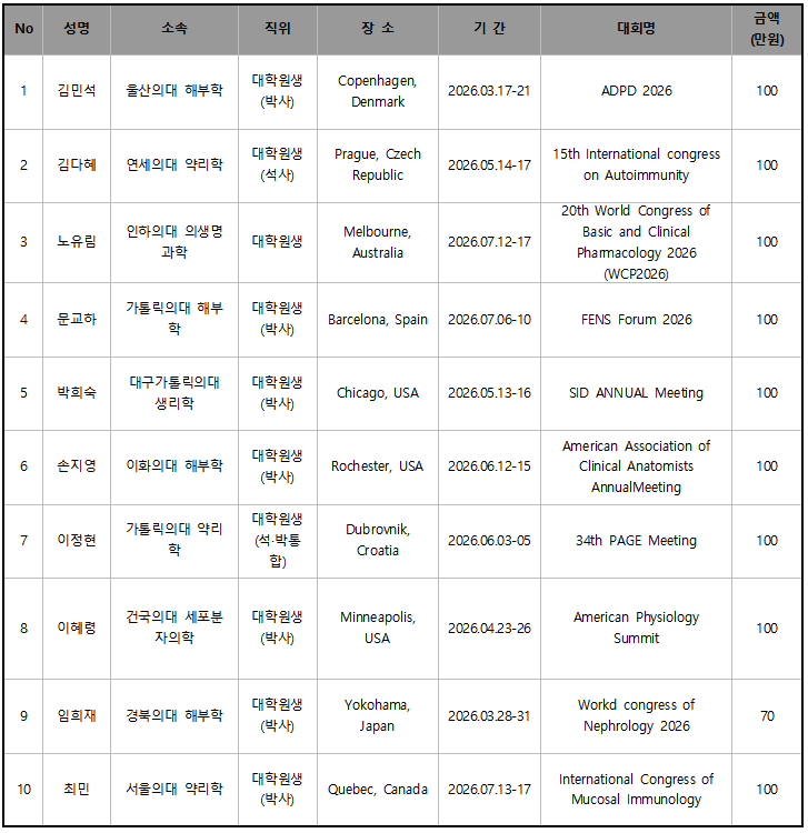 [사업활동] 2026년 상반기 국제학회 참가여비 보조금 지원 대상자 선정 |