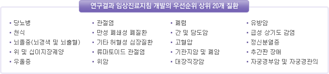 | 2006³â ½ÃÇàµÈ ÀÓ»óÁø·áÁöħ°³¹ß Á¤Ã¥¸ðÇü ¼ö¸³ ¹× »ç·ÊÁöħ °³¹ß¿¬±¸ °á°ú¿¡ µû¶ó Áúº´¿¡ ÀÌȯµÈ ȯÀÚ¼ö°¡ Å©°í, Áúº´ ºÎ´ãÀÌ Ä¿ ½É°¢µµ°¡ ³ôÀ¸¸ç, ºñ¿ë ºÎ´ã ¶ÇÇÑ Ä¿ ÀÓ»óÁø·áÁöħÀÇ °³¹ß¿¡ ¿ì¼±ÇÏ´Â 20°³ ÁúȯÀÇ ÀÓ»óÁø·áÁöħÀ» ¿ì¼±ÀûÀ¸·Î ¼±Á¤ÇÔ. ¿¬±¸°á°ú ÀÓ»óÁø·áÁöħ °³¹ßÀÇ ¿ì¼±¼øÀ§ »óÀ§ 20°³ Áúȯ |