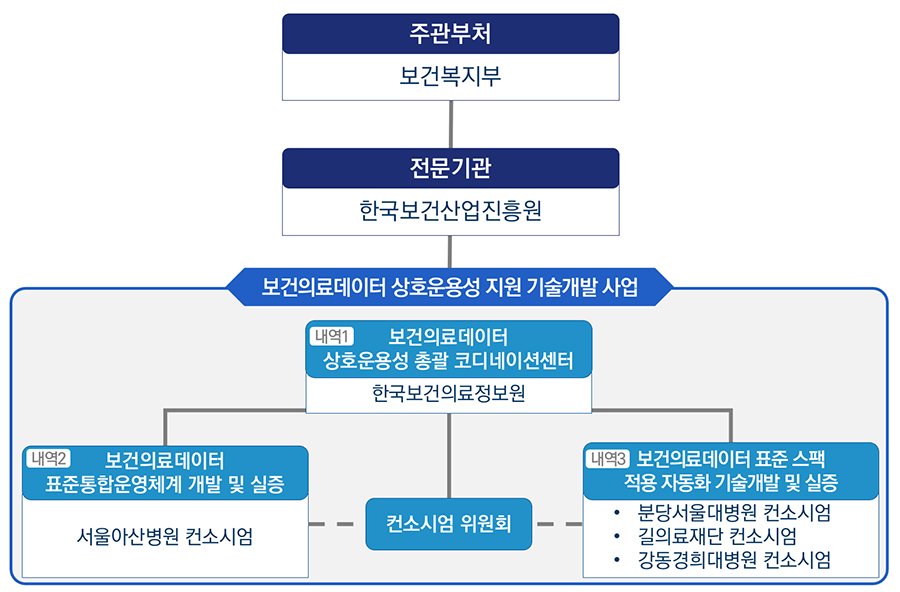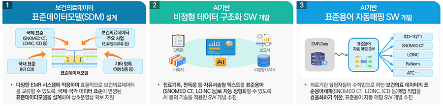 이질적인 의료 데이터의 문제점을 극복하고 활용도를 높이기 위하여 정부 주도의 대규모 의료 데이터 표준화 연구개발 프로젝트가 시작되었다. '보건 의료 데이터 상호운용성 지원 기술 개발' 사업은 보건복지부 주관으로 2025년부터 5년간 민간 연구비 포함 총 361억 원을 투입하여 인공지능 기술을 통해 국가 차원의 표준 데이터 체계를 구축하는 것을 목표로 한다.